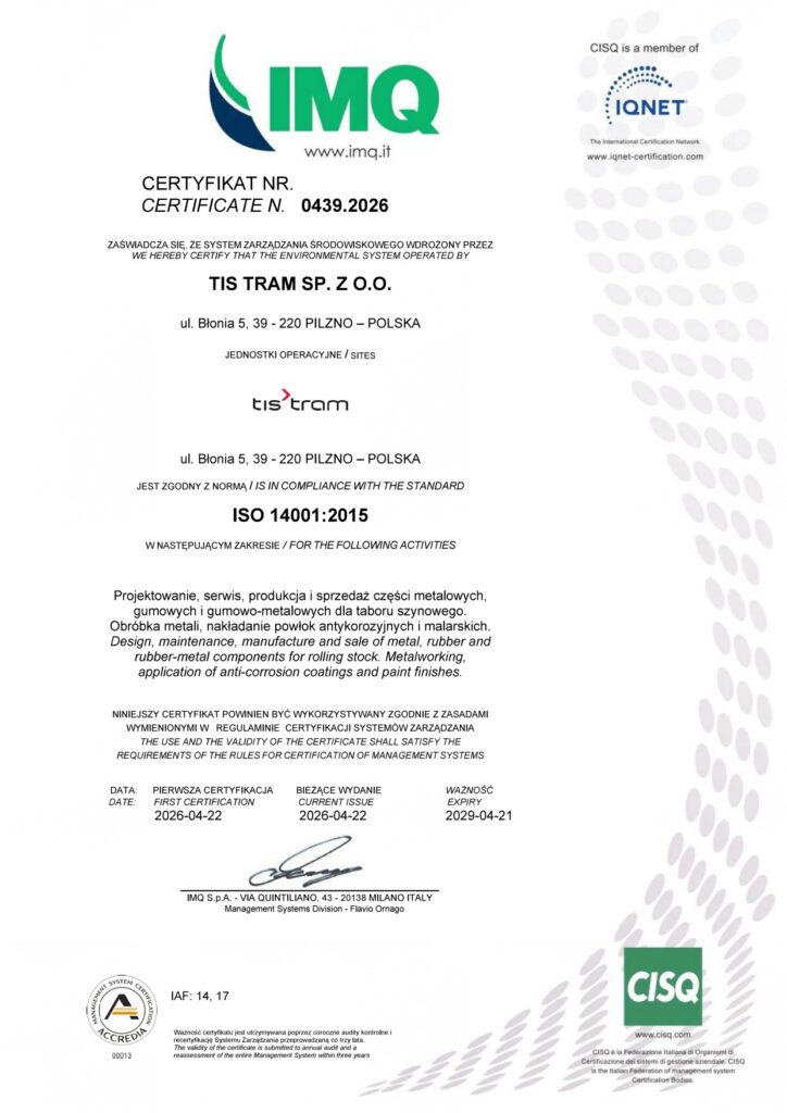 Die Zertifizierung umfasst: Konstruktion, Service, Herstellung und Vertrieb von Metall-, Gummi- und Gummi-Metall-Komponenten für Schienenfahrzeuge sowie Metallbearbeitung und das Aufbringen von Korrosionsschutz- und Lackbeschichtungen.